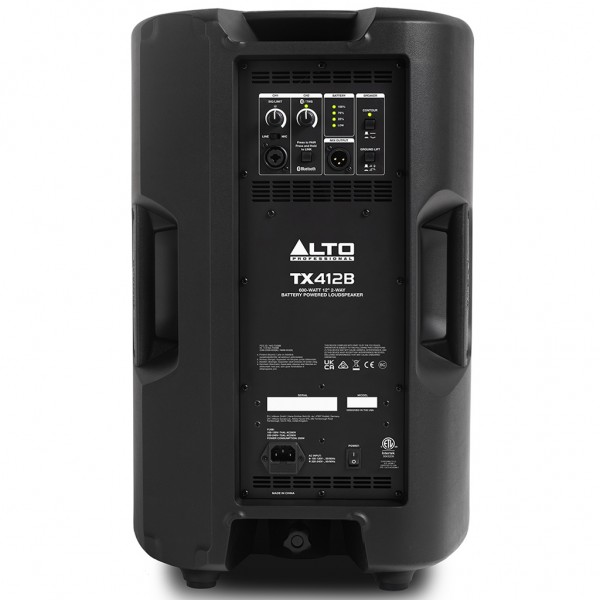 diffusore portatile amplificato alimentato a corrente e a batteria – 2 vie – amplificatore da 300 W rms in classe D (150 W sui bassi e 150 W sugli alti) e 600 W di picco ( 300 W sui bassi e 300 W sugli alti) – copertura 90°x60° – 120 dB Max SPL @ 1 m – 70–20.000 Hz – tweeter da 1" – woofer da 12" – mixer integrato a 2 canali – 1 ingresso microfonico + 1 ingresso linea + 1 ingresso Bluetooth tutti con volume – EQ contour – possibilità di collegamento in stereo a un altro diffusore TX 412 o TX 412 B via Bluetooth – autonomia della batteria fino a 10 ore – predisposizione per stand treppiede – dimensioni: 602 x 381 x 343 mm – peso 13.3 Kg – cabinet full grill in abs