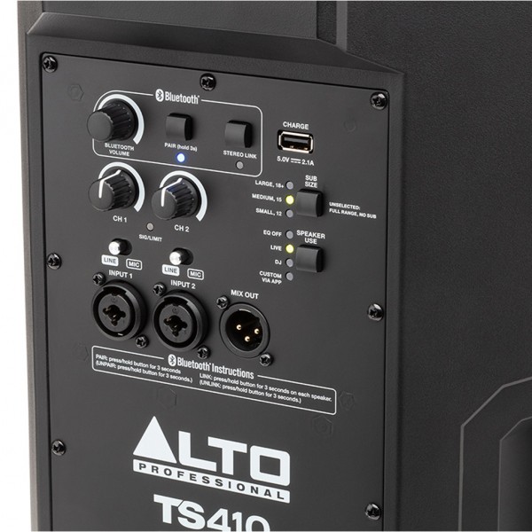 diffusore bi-amplificato in classe D a 2 vie – 1000 W rms (650 W sui bassi e 350 W sugli alti) e 2000 W di picco ( 1300 W sui bassi e 700 W sugli alti) – 48–20.000 Hz – 130 dB di picco e 127 dB SPL @ 1 m continui – tweeter ceramico da 1" con bobina da 1.4" – woofer da 10" – uscita per il collegamento a un secondo diffusore – 2 ingressi line/mic con volume separato e limiter – 1 ingresso Bluetooth linkabile in TWS a un secondo diffusore – setting per definire la dimensione di un eventuale subwoofer – equalizzatore a 3 preset: live, dj e custom via app – porta di ricarica USB 5V 2,1 A – Free Alto App (iOS/Android) per la confiugurazione e il controllo di alcune funzioni – pole socket per il posizionamento su stand – cabinet full grill in abs – dimensioni: 320 x 536 x 317 mm – peso 11.8 Kg