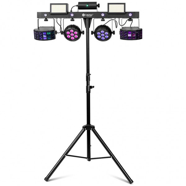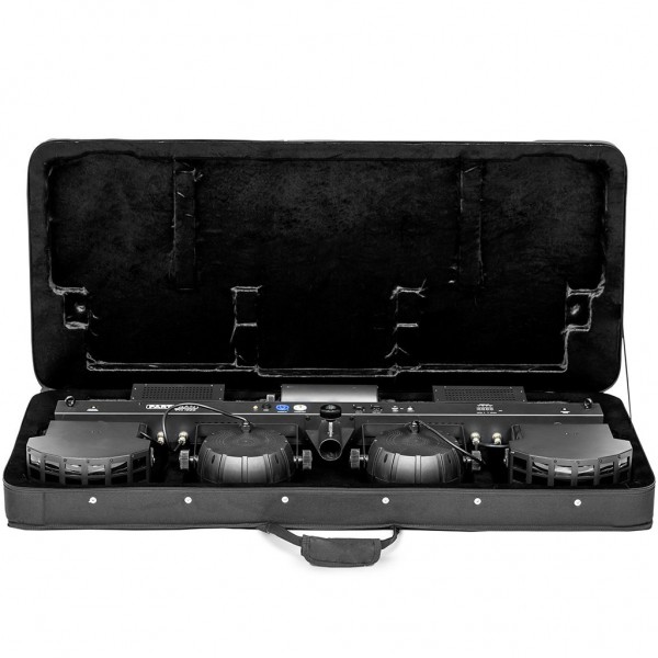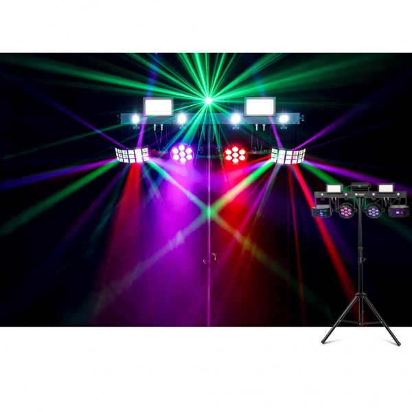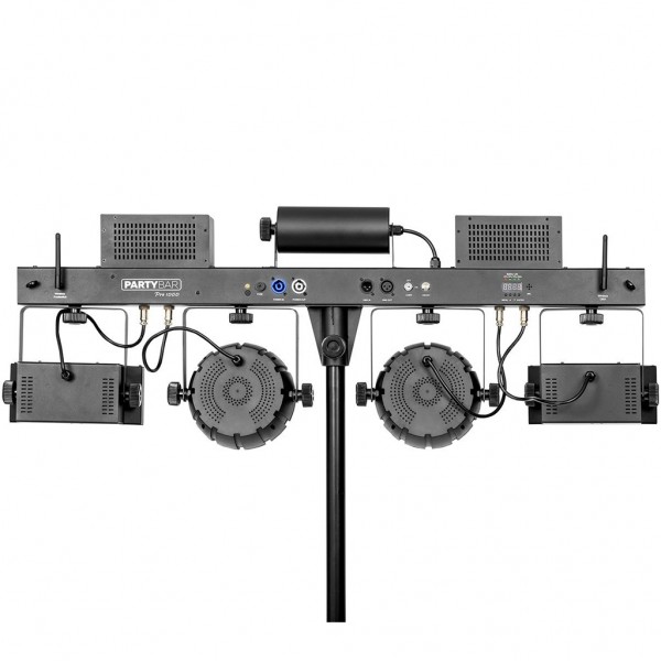kit di illuminazione dmx completo per dj - sfrutta il sistema wireless a 2.4GHZ per collegare in serie più PartyBar e MiniHex Par senza fili - controlla le luci a tempo di musica, in automatico, con protocollo dmx512 sia a cavo che wireless, con il telecomando IR incluso, o con la pedaliera Footswitch senza bisogno di alcun cavo - trasporta e monta facilmente il kit con la borsa e lo stativo incluso fino a 2.1m di altezza - illumina i tuoi eventi con 2 par led 7x8W RGBW direzionabili, 2 derby led 6x3W RGBWA-UV direzionabili, un laser verde/rosso, 2 led blinder ed i 4 led White/UV presenti sulla barra - grazie alla batteria di emergenza al litio integrata è possibile lavorare fino a 30 minuti senza collegare l'alimentazione, per spostare ad esempio durante il set la PartyBar
