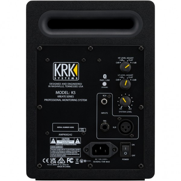 monitor biamplificato a 2 vie da 60 W – 58–40.000 Hz – tweeter da 1" – woofer da 5" – ingresso bilanciato e sbilanciato – ricevitore Bluetooth TWS – regolazione del volume, del filtro passa-basso e passa-alto – pannello frontale rosso e cabinet nero – cono nero