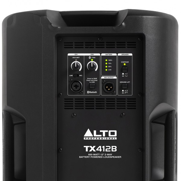 diffusore portatile amplificato alimentato a corrente e a batteria – 2 vie – amplificatore da 300 W rms in classe D (150 W sui bassi e 150 W sugli alti) e 600 W di picco ( 300 W sui bassi e 300 W sugli alti) – copertura 90°x60° – 120 dB Max SPL @ 1 m – 70–20.000 Hz – tweeter da 1" – woofer da 12" – mixer integrato a 2 canali – 1 ingresso microfonico + 1 ingresso linea + 1 ingresso Bluetooth tutti con volume – EQ contour – possibilità di collegamento in stereo a un altro diffusore TX 412 o TX 412 B via Bluetooth – autonomia della batteria fino a 10 ore – predisposizione per stand treppiede – dimensioni: 602 x 381 x 343 mm – peso 13.3 Kg – cabinet full grill in abs